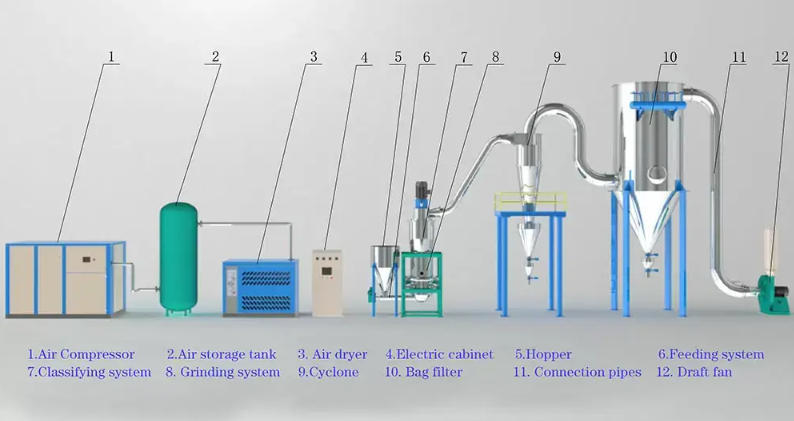 LHL Jet Mill menggunakan udara terkompresi yang dibekukan, disaring, dan dikeringkan untuk membentuk aliran udara supersonik yang disuntikkan ke dalam ruang penghancur, mencairkan material. Partikel yang dipercepat bertumbukan di persimpangan beberapa aliran udara nosel, mencapai penghancuran ultra-halus melalui tumbukan, gesekan, dan gaya geser yang parah.